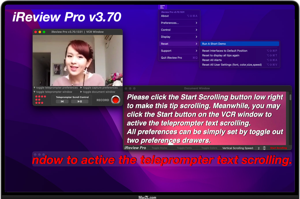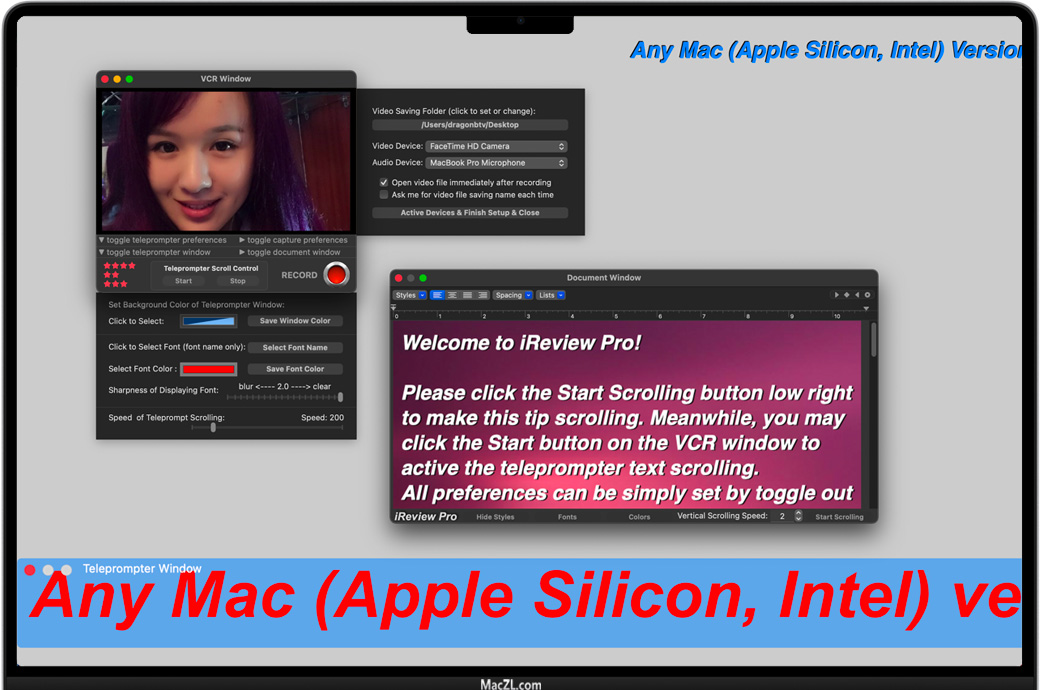iReview Pro for Mac 是一款配有双专业提词器的录像机!不仅是水平提词器文本滚动,还有垂直文档和图片滚动!您现在可以将iPhone用作无线摄像头了。iReview 非常适合制作视频评论、YouTube 视频、演示文稿、讲座,甚至是视频消息。配备双专业提词器的录像机!不仅是水平的提词器文本滚动,还有垂直的文档、图片滚动!一切都可以针对水平文本滚动进行自定义,例如速度大小字体颜色背景模糊,文本、PDF 页面甚至图片都可以在垂直文档滚动窗口上滚动。
