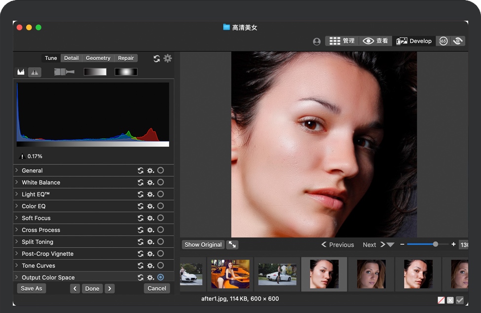 使用 Skin Tune 工具均匀色调和恢复拍摄对象的光泽,以及提亮和平滑。