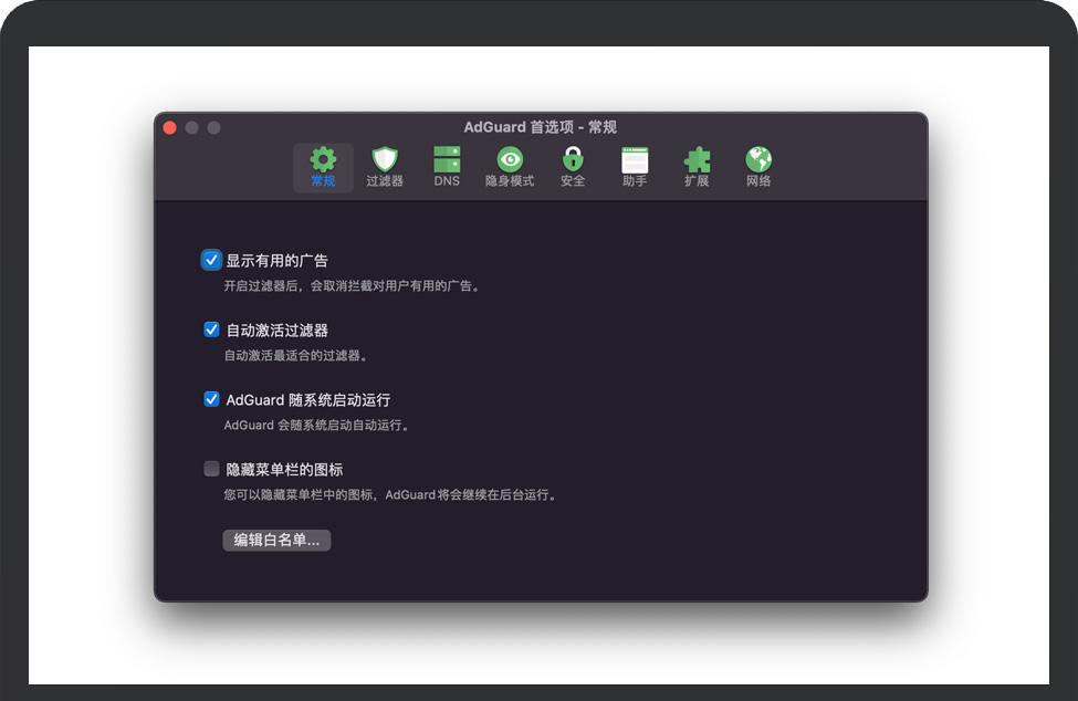 浏览器AdGuard“拦截”你的浏览器的流量,并通过自己的过滤引擎引导它。在Chrome, 火狐或任何一款你喜欢的浏览器里 —— 你不需要安装任何特定的扩展来拦截广告。AdGuard程序可过滤任何浏览器的广告。(不过,你可能会想额外安装AdGuard浏览器助手 —— 一款桌面应用的一个小扩展,它可以帮你正确地管理浏览器中的过滤过程)。 | 网络过滤AdGuard需要在网络层面工作来控制你设备上的所有应用程序。为此,我们使用一种特殊的网络驱动程序,它能激活网络上数据的实际传输和接收。 | |