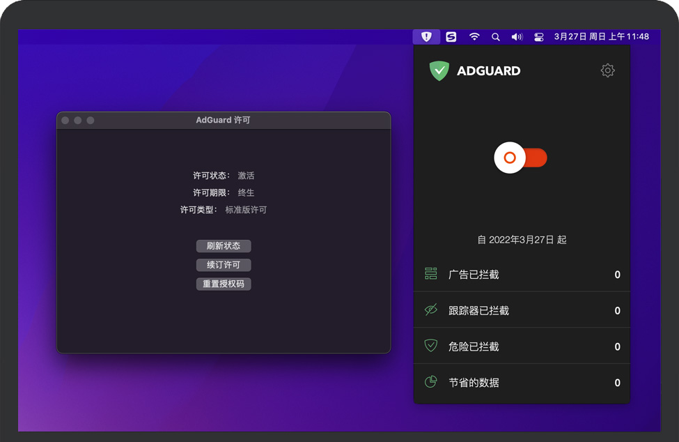 隐私保护AdGuard 使用由 AdGuard 团队设计的防跟踪保护过滤器对抗监视您的各种跟踪器和分析系统。其积累的规则让其有能力对抗所有试图窃取您私人数据的在线分析系统。 | 过滤应用内部广告有众多应用虽优秀,但总是忍不住给您推荐各种广告。AdGuard 可通过过滤 Mac 系统上应用的流量删除恼人的广告。 | ||