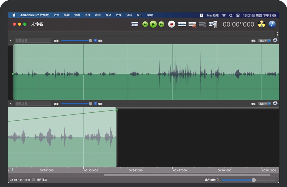 Amadeus Pro是功能齐全的多轨编辑器。每个音轨的音量和声像都可以独立于其他音轨进行调整。每个音轨可以分为多个音频片段,可以轻松地相互独立拖动。此外,音频单元可以实时应用于各个轨道,而无需进行任何破坏性的编辑。