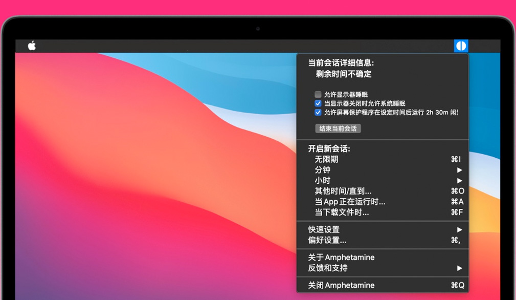 保持Mac唤醒状态从Amphetamine菜单快速启动一个保持唤醒状态的会话,以保持Mac处于唤醒状态。