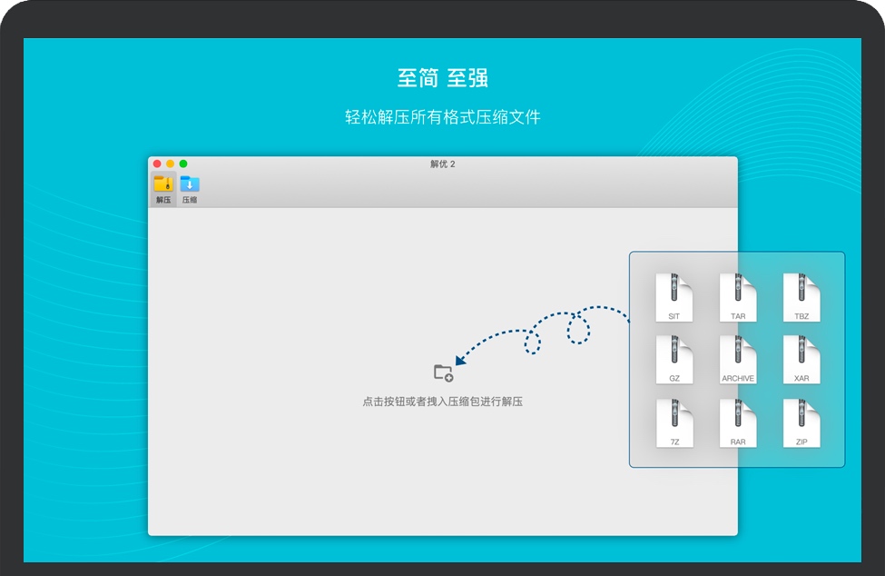 您可以拖动文件到“解优 2”图标进行解压,也可以设置“解优 2”为压缩包的默认打开方式后鼠标双击进行解压。