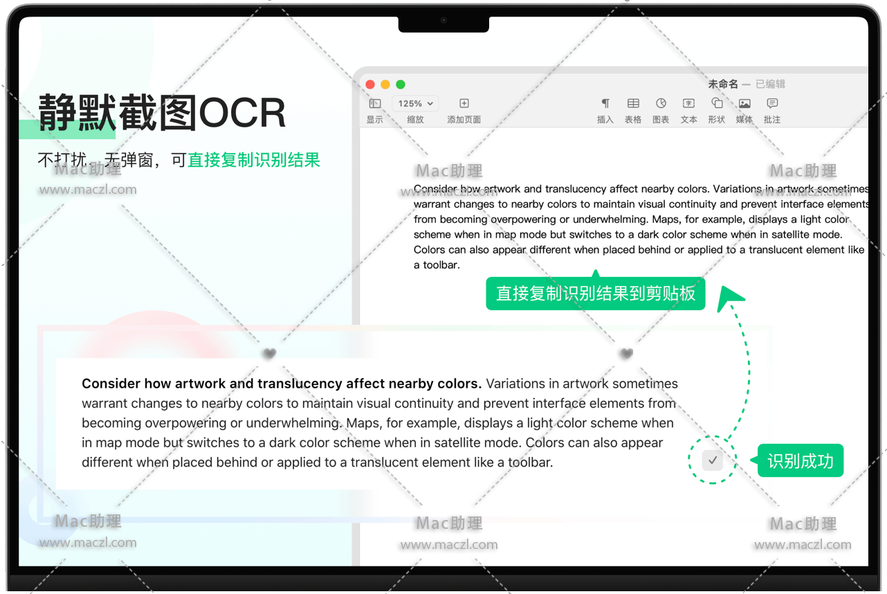 - 静默截图 OCR:按下静默截图 OCR 快捷键(默认 ⌥ + C),截取需要识别的区域即可后台识别文本