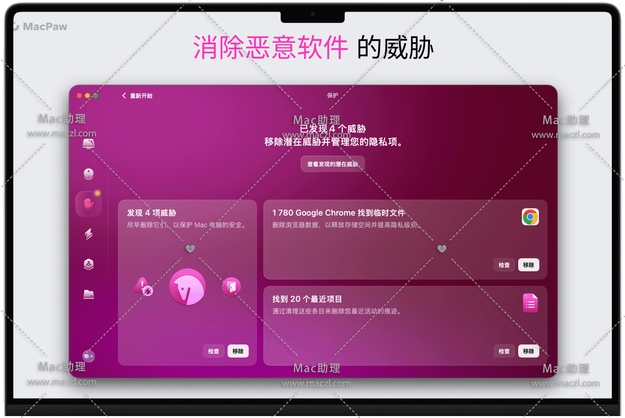 恶意软件删除和隐私尽管 macOS 不像其他系统那样容易感染,但它仍然容易受到病毒的影响。阻止恶意程序的唯一方法是定期对 Mac 进行恶意软件扫描。CleanMyMac 保护模块将帮助您消除病毒威胁,并按需擦除您的浏览数据。 |