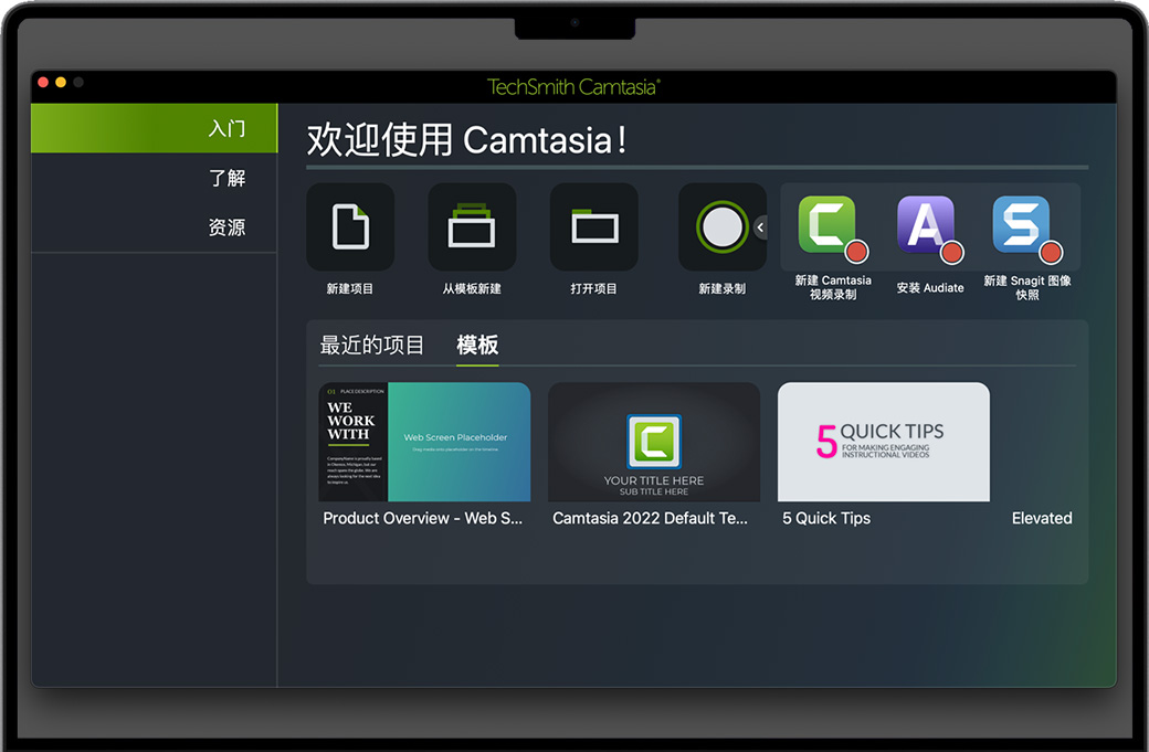 使用Audiate编辑视频你知道编辑视频最糟糕的部分是什么吗?编辑视频。只需编辑文本即可进行视频编辑!Camtasia 2022 + Audiate是视频粗剪的最快方式。只需使用Camtasia录制您的视频,然后将其带Audiate,即可通过消除犹豫点、不必要的漫无边际以及您说错的地方进行快速编辑。 | Camtasia HomeCamtasia Home让您可以快速访问开始新项目或结束现有项目所需的一切。Home将创作工具、资产和产品支持置于Camtasia的核心部分。 | 新模板从Camtasia中已有的模板和资源开始。快速选择您需要的内容,让您的视频栩栩如生,并轻松自定义其中的元素。 |