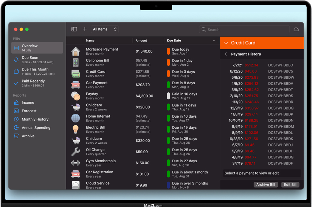 Chronicle for Mac 绝对是一款你会羡慕的漂亮的个人理财应用。使用Chronicle追踪和支付账单,管理您的个人财务,Chronicle是Mac上最简单的账单规划工具。收到通知,不要错过下次付款的到期日,永远不用为迟到支付额外费用。将所有账单放在一个地方,安排、检查和分析,计划预算。适用于Mac、iPhone、iPad和iPad的通用应用程序。使用Chronicle Cloud同步在所有设备上的Mac上查看账单,如果您愿意,甚至可以与合作伙伴共享账单。