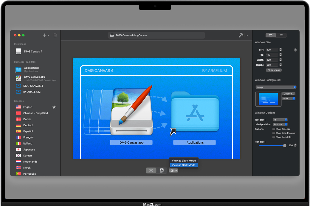 我们都见过挂载磁盘镜像时需要点击的许可协议,但要自己去做,那是一场噩梦。让DMG Canvas来为你解决这个问题。如果你的公司想确保用户预先看到许可协议,那是小菜一碟。只要把你的许可证文本放到DMG Canvas中,你就完成了。它甚至支持样式和多国语言。