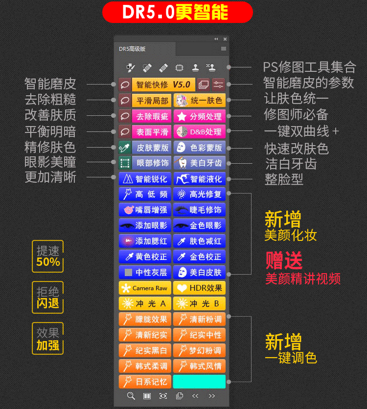DR5 for Mac专业增强版 是一款功能强大的Mac Ps磨皮插件集合版,整合了dr5磨皮美妆功能和工笔画功能,实现一个面板上集成众多修图功能,帮助用户一键磨皮降噪美白、局部平滑、表面平滑、改变色调、斑点祛除、液化校正、美白牙齿、眼睛增强等等,专注人像修饰,是您日常修图必备插件。