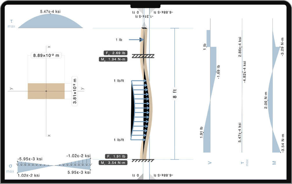 图表可视化剪切力,弯矩,斜率,挠度和内应力。 | ![]() |