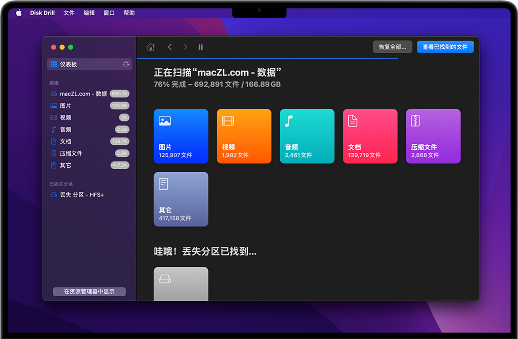 硬盘或者SD卡突然空白或者无法识别?你可能遇到了分区丢失的问题。数据仍在那里,但是Mac电脑需要找到数据的“地图”丢失了。如果它还在那里的话,Disk Drill可以让你恢复丢失的分区并找回你的数据。所有的可安装存储设备都支持。基于文件系统的各种恢复方法都可以使用,甚至格式化的驱动器都可以恢复。