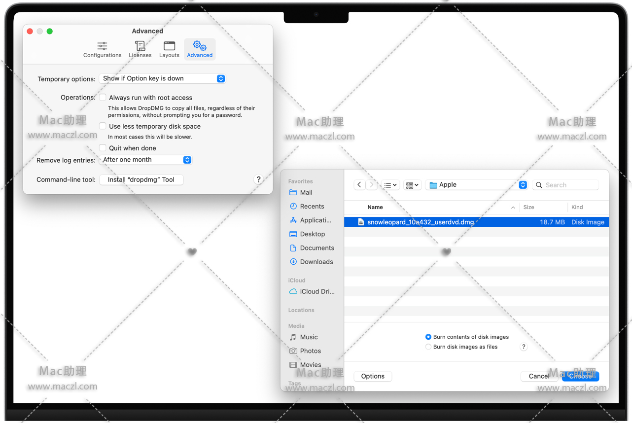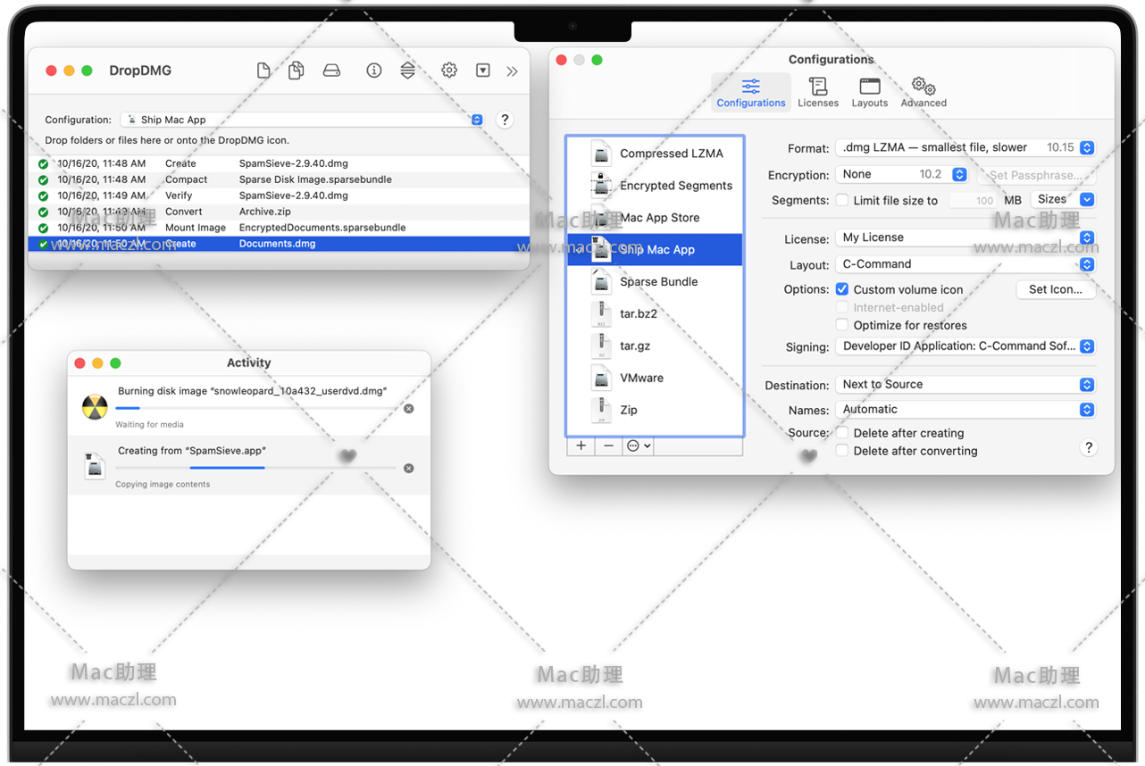 DropDMG支持高级功能,例如加密和分段磁盘映像、保存为配置的设置组和临时选项。通过AppleScript、Automator或命令行自动化DropDMG。从Xcode或您的自定义 Makefile或构建脚本运行dropdmg 工具。在版本控制下存储应用程序.dmg的资源。