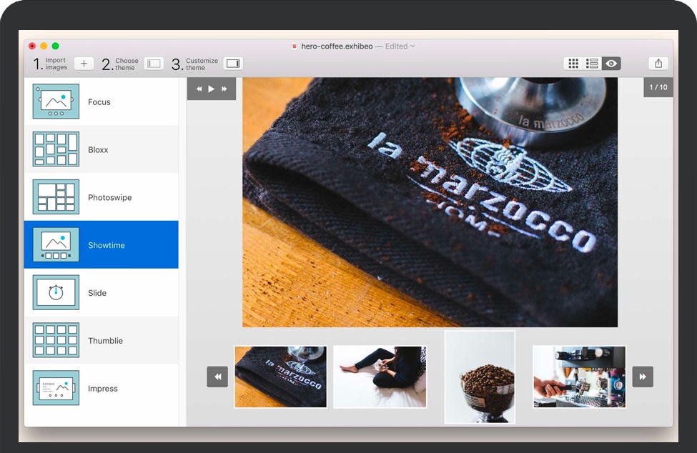 Exhibeo 2 for Mac 是一款网页相册集、幻灯片、画廊制作软件。只需要将图片导入到 Exhibeo,然后选择模板,再导出为 web html 页面即可。不需要编码,每个主题都有选项可供选择。无需学习 html/css/javascript 即可制作。