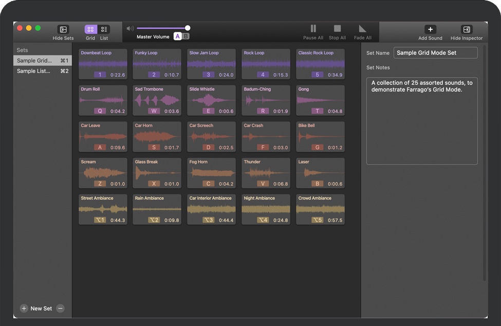 Farrago for Mac 是快速播放声音片段,音频效果和音乐片段的最佳方法。播客可以在录制会议期间使用Farrago来包含音乐伴奏和声音效果,而剧院技术人员可以在现场表演中播放音频。无论您是需要快速访问大型声音库还是要播放已定义的音频列表,Farrago都已准备就绪!