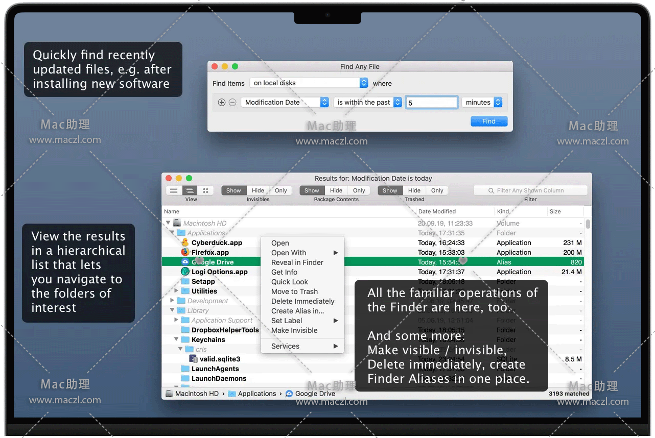 Find Any File for Mac 是一款强大的多条件文件查找工具。与 Spotlight 相反,它不使用数据库,而是使用文件系统驱动程序的快速搜索操作。这使您可以搜索文件属性,例如名称,日期,大小,种类等,可以找到Spotlight无法找到的文件,例如,捆绑包和软件包内的文件以及通常被Spotlight搜索排除的文件夹内的文件。