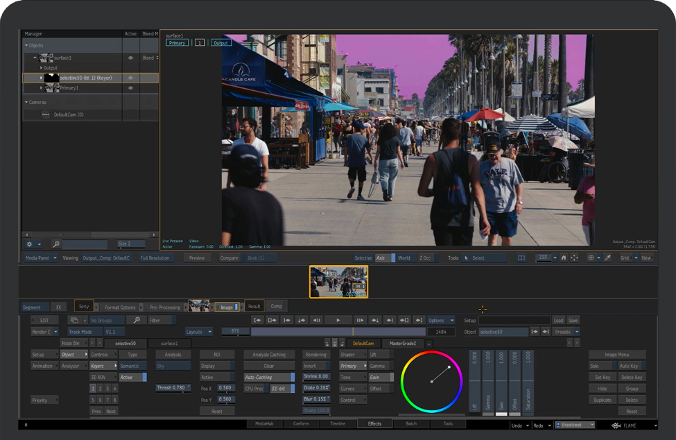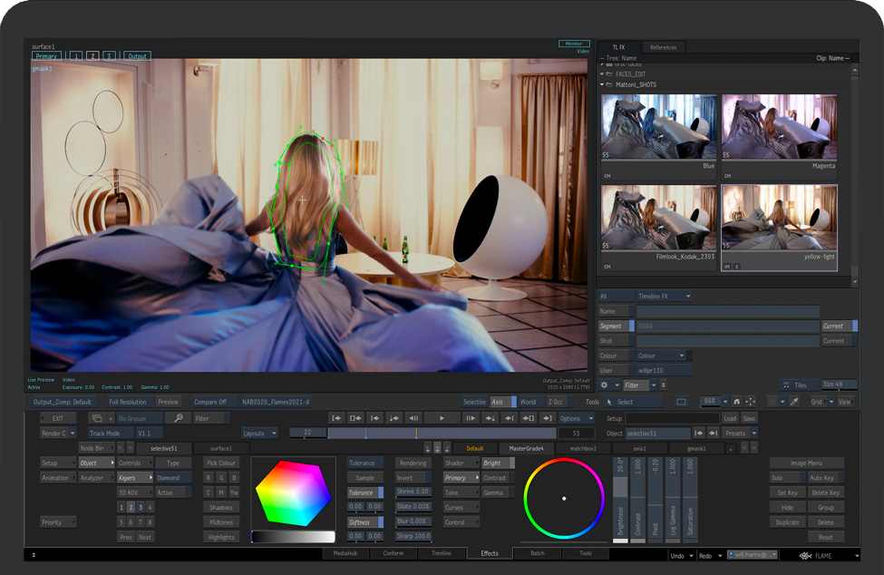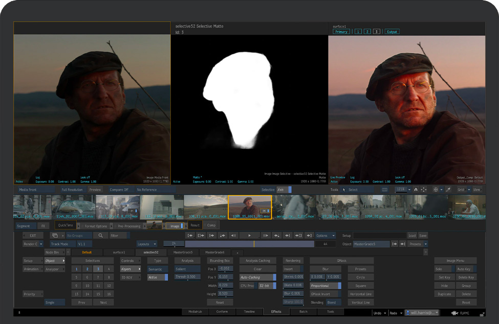 效果选项卡:基于任务的环境使用各种效果应用颜色分级工具的镜头到镜头导航原则。 | 图像时间轴FX和批处理节点使用集成工具集对任何图像进行颜色、美容工作、生产修复任务或自由形式的创意处理。 |
