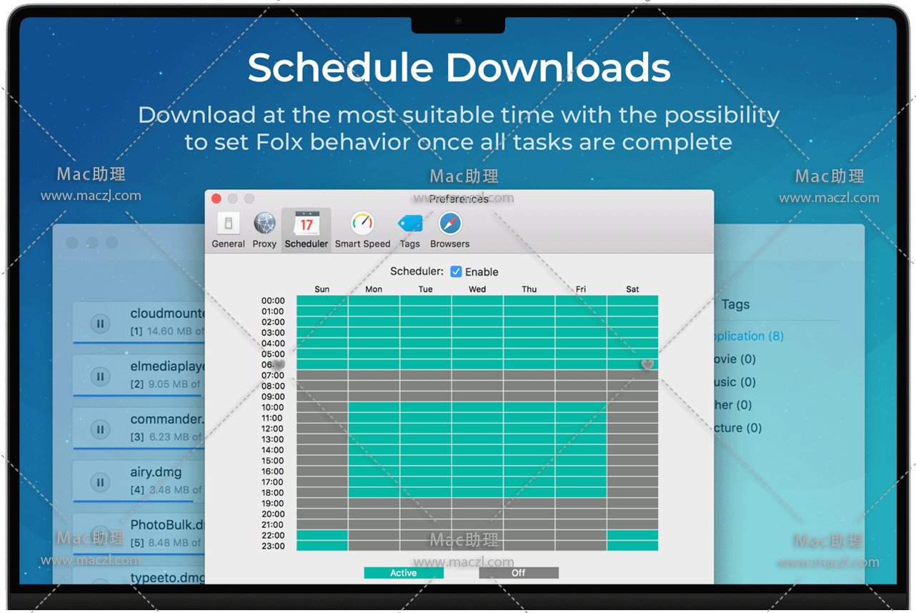 您可以选择最适合的时间开始下载,并设置Folx在完成下载后的行为:关闭系统,切换到睡眠模式,或者直接退出Mac的下载管理器。