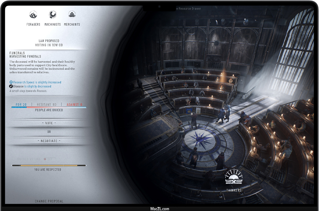 你的市民希望能在城市的管理运营方面参与意见。每个派系都有自己的意识形态和对未来的想法,但也有一个共同点——对权力的无尽渴求。你必须在议会厅中谨慎选择盟友。