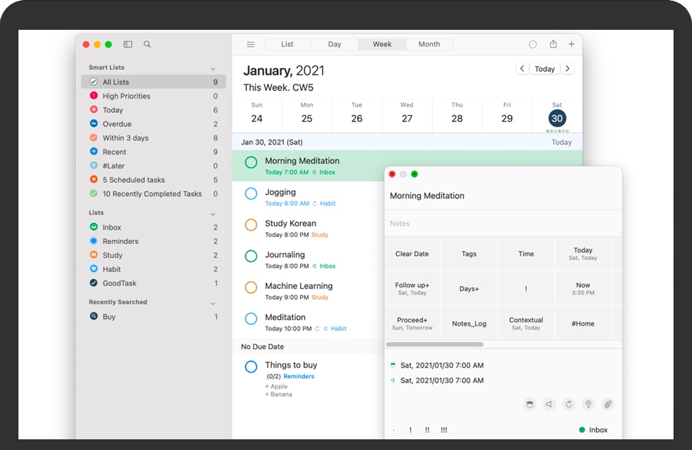 GoodTask for Mac 是一款基于Apple提醒和日历、功能强大的任务/项目管理应用程序。它既可以用作简单的待办事项检查列表,也可以用作复杂的项目管理工具,帮助完成重大项目。GoodTask让您通过各种不同的视角来观看自己关注且需要完成的事务。有了GoodTask,您可以更好地管理自己的任务、项目,甚至是生活。