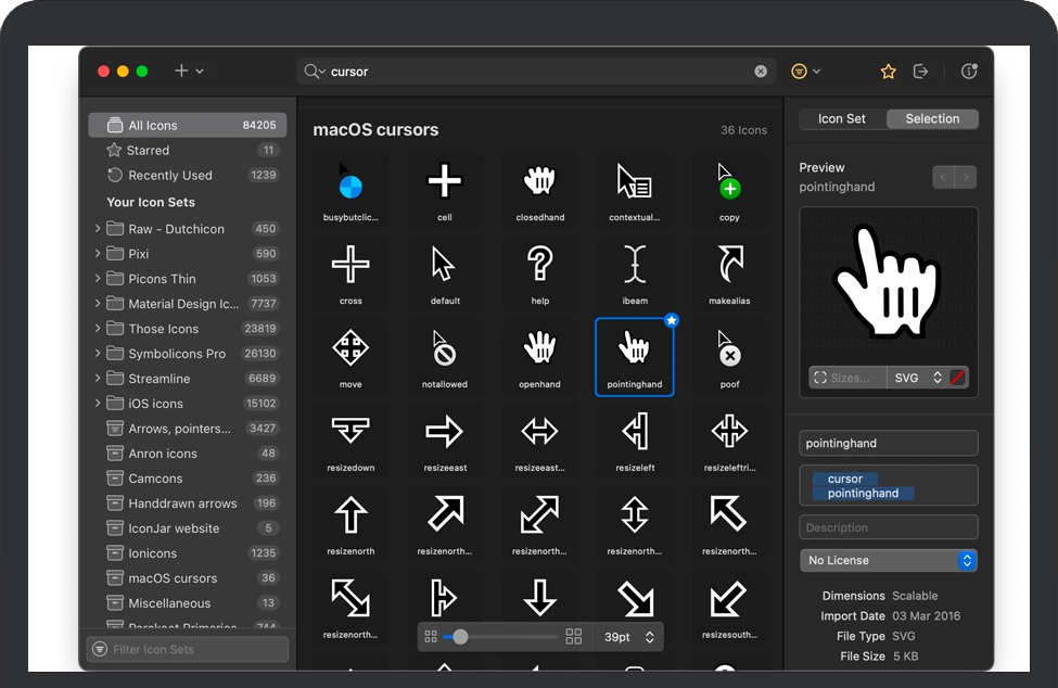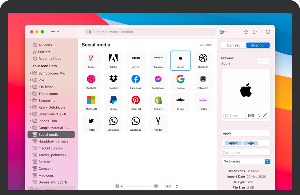 IconJar for Mac 是一款苹果电脑上优秀的图标素材管理工具,可以帮助我们管理和查找图标图片素材,可以搜索、预览、使用和导出图标的应用。帮助设计师管理图标素材,提高工作效率。