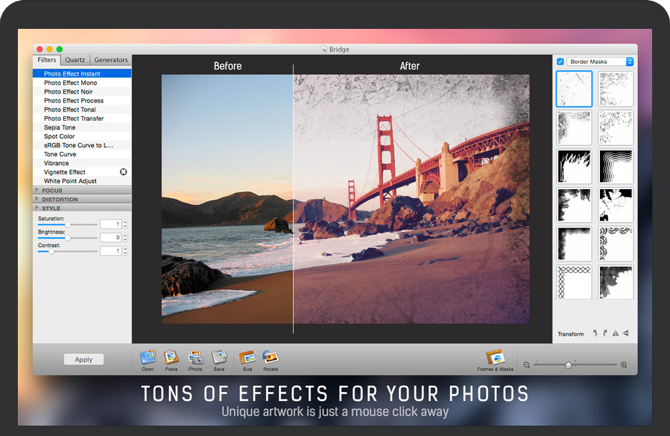 Image Tricks Pro for Mac 是一款拥有令人惊叹的效果、图像蒙版和数码相框图片编辑器。Image Tricks Pro允许您将macOS Core图像过滤器和石英合成应用到照片中,以获得惊人的效果。除了照片效果,Image Tricks Pro还嵌入了图像生成器,用于创建随机图像,以及一组相框和边框,用于进一步装饰图像。