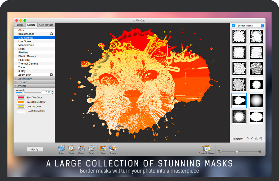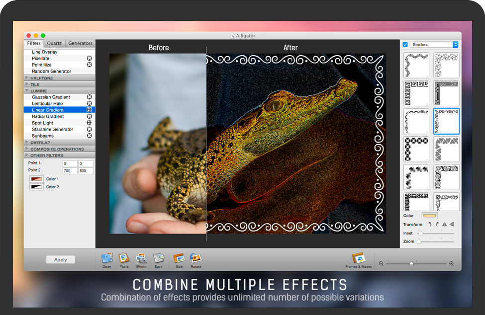 核心图像过滤器使用超过 110 个核心图像滤镜增强照片。 | ![]() 石英成分应用核心图像滤镜的时尚组合。 | ![]() 图像蒙版使用 70 多个图像蒙版来蒙版您的照片。 | ![]() 相框将照片放置在 20 多个数码相框中。 | ![]() 图像生成器为引人入胜的背景制作随机图像。 |