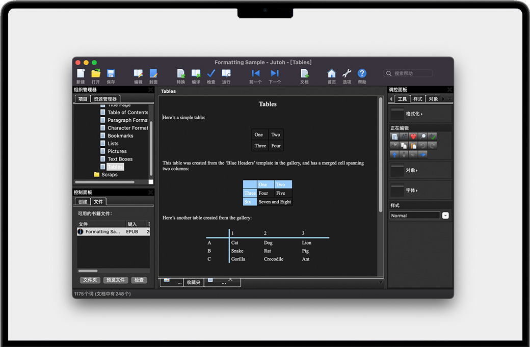 Jutoh 以 Epub 2 和 Epub 3、Kindle (Mobipocket)、HTML、CBZ 和纯文本格式创建电子书。Epub 和 Kindle 满足大多数要求 - Epub 是电子书阅读器制造商和出版商支持最多的标准,包括 Apple、Google、Barnes & Noble 和 Kobo,而 Mobipocket 则覆盖亚马逊的 Kindle 平台。