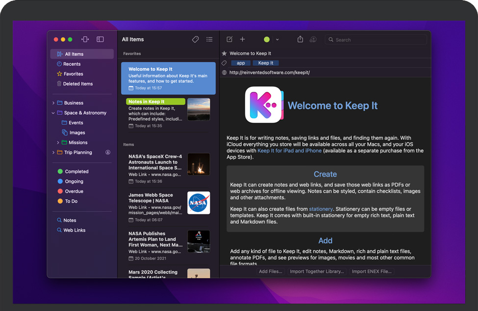 Keep It for Mac 是一款笔记本、剪贴簿和组织者,非常适合写笔记、保存网络链接、存储文档、图像或任何类型的文件,以及再次查找它们。在Mac上可用,Keep It是您想要放置的所有东西的目的地,相信您以后会再次找到它们。Keep It 2 添加了 Finder 集成、快速打开、快速文件、阅读器模式和最小网页、在侧边栏中重新排序列表的能力、重新设计的项目列表、顶部的收藏夹、改进的搜索、改进的 PDF 查看和 Markdown 预览、改进项目之间的链接,复制项目的能力等等。