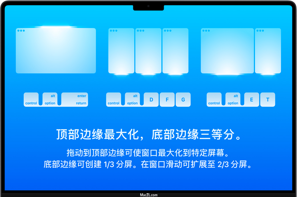 拖动到顶部边缘可最大化给定屏幕上的窗口大小。底部边缘创建三分之一。滑动它以扩展到三分之二。