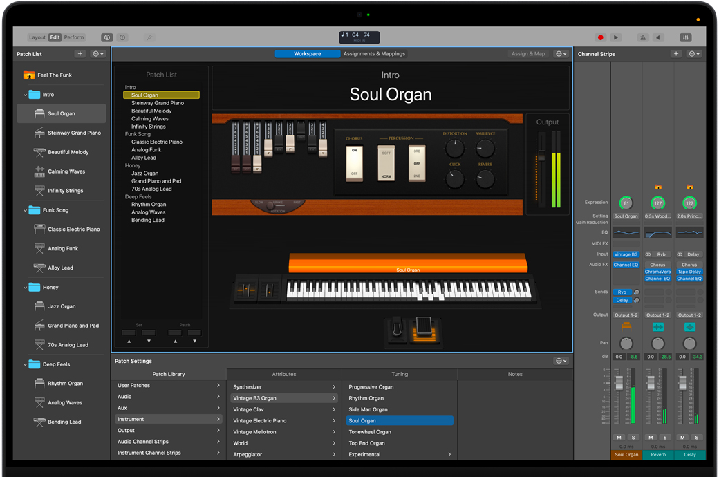 - 使用 Vintage B3、Vintage Electric Piano 和 Vintage Clav 弹奏古典键盘的仿真模型