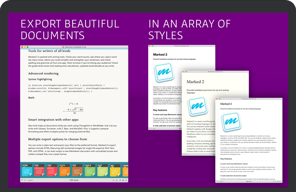 Marked 2 for Mac 是一款出色的写作和Markdown查看程序。Marked为作者提供了一组丰富的功能,包括拼写/语法检查、简化句子的技巧以及字数、句子数、句子复杂度、阅读时间和年级评分。Marked的导出功能可以轻松地从Markdown文件创建漂亮的文档。花更少的时间思考语法和格式,花更多的时间进行创作,并在进行过程中消除错误并改进您的写作。一个完美的应用程序,可以让技术作家和散文作家都更有效率。