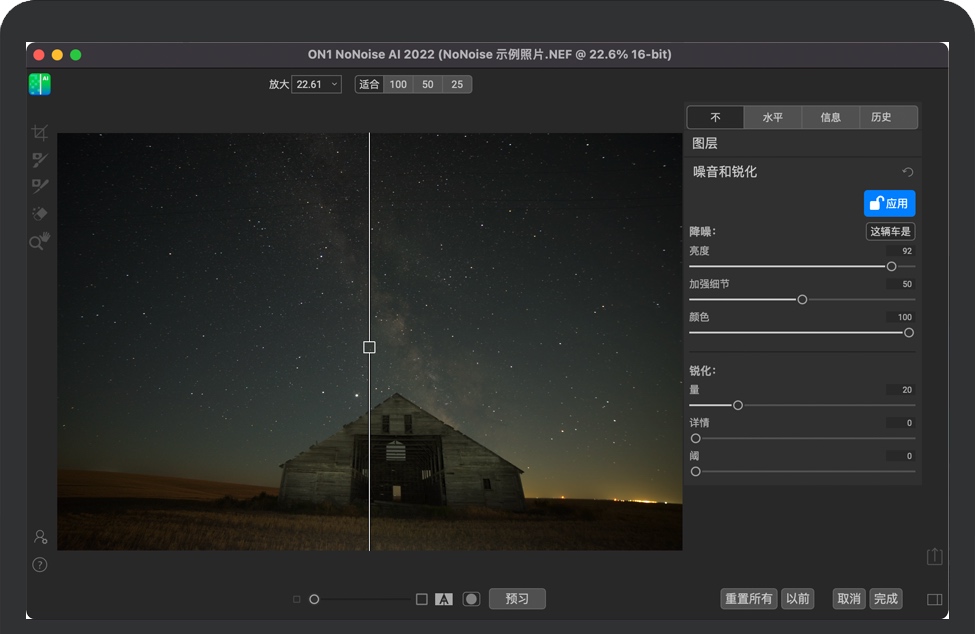 ON1 NoNoise AI 2022 for Mac 是一款去除图像噪点和专业的摄影降噪软件。使用基于AI的 No Noise AI去除噪点并获得照片中最清晰的细节。ON1 NoNoise AI智能去除所有图像噪点,同时智能恢复和增强细节。NoNoise AI通过支持常见的照片编辑器和文件格式集成到您的工作流程中,包括保存保持完整色调和颜色范围的 DNG 原始文件。