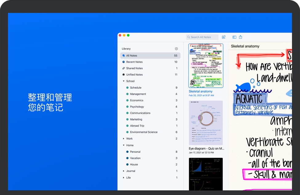 Notability for Mac 是一款功能强大而极致简约的笔记与注释工具。支持边写字边录音,开会的时候领导布置任务记不住、上课的时候老师讲的听不懂?没关系,录下来回去慢慢研究。支持画笔功能,可以画草图,实现课堂、办公室和家庭场合的完全无纸化。支持将手写内容转化为文本。 Notability 包含功能齐全、左对齐的打字工具,还带有各种字体、字号和 颜色。