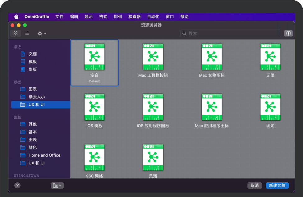 Visio导入/导出:在 OmniGraffle 中直接打开 Microsoft Visio® 文稿(VSD 或 VDX)、Visio 模板 (VSS) 和 Visio 样板 (VST)。导出至 Visio XML 文稿 (VDX)。