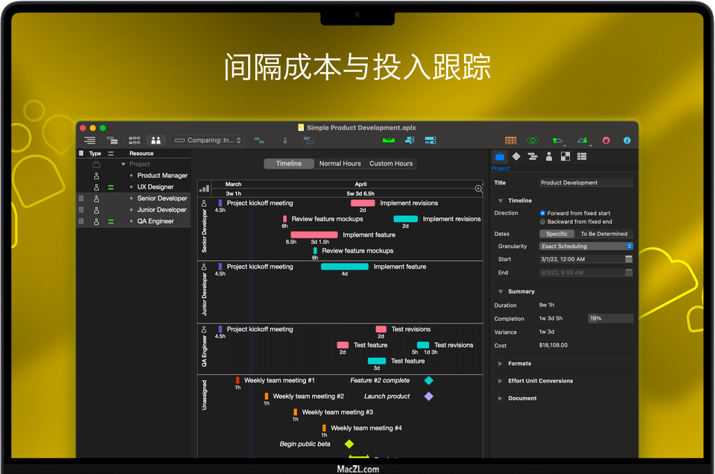 OmniPlan Pro for Mac 是一款用于帮助您对项目进行可视化、维护以及简化。细分任务,优化所需资源、控制成本并监控您的整个计划 — 全部一目了然。与您的同事协作,分享每个细节,更新日历,或综合使用。逐个接受以及拒绝更改,或一次性全部处理完。OmniPlan 3 拥有诸如甘特图、网络图、进度表、摘要、里程碑和高亮关键路径等功能,不论项目是简单还是复杂,都能让您轻松地进行管理。