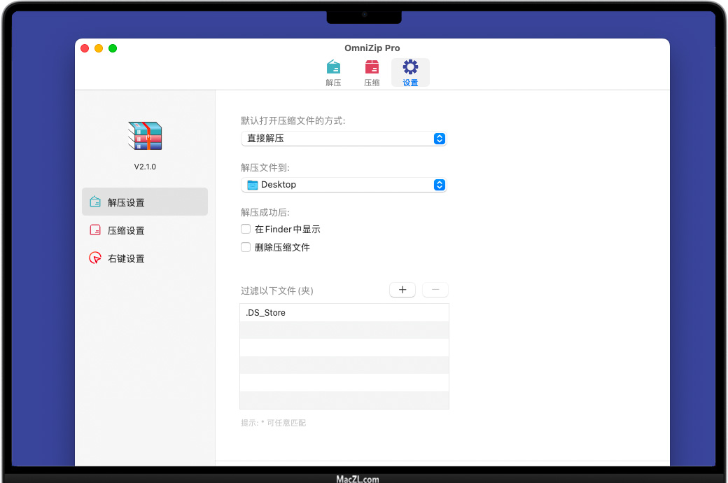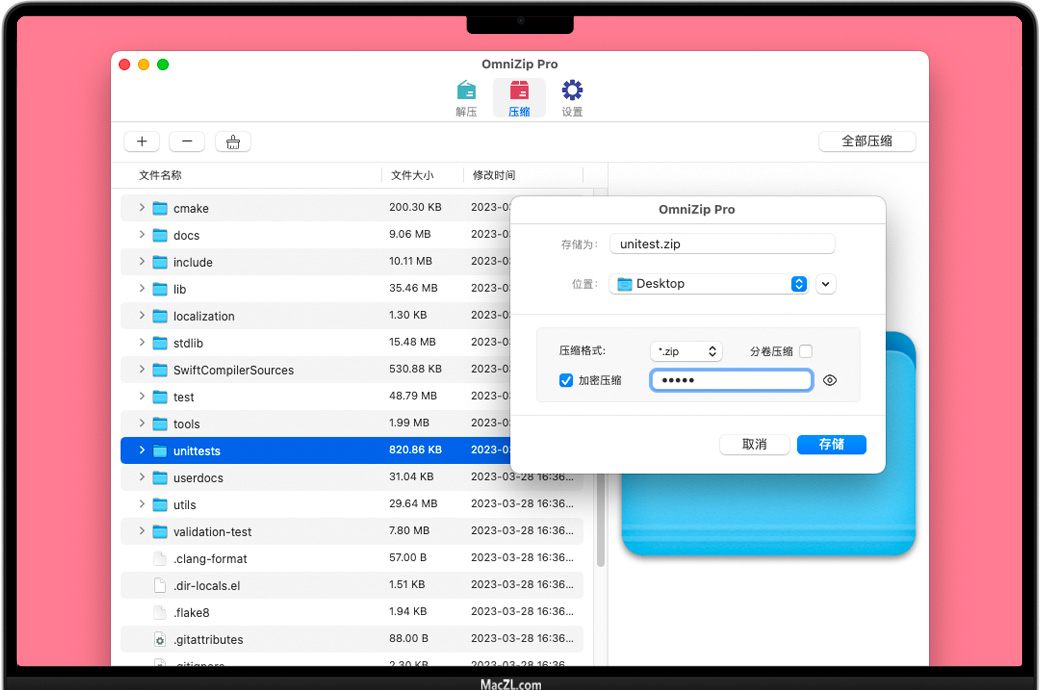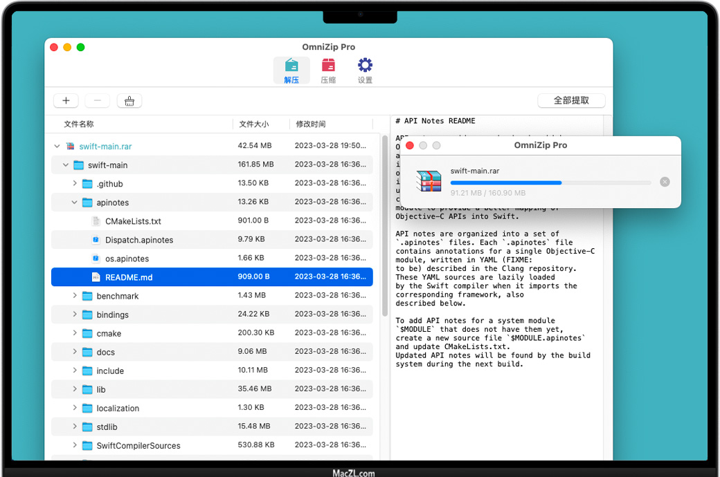 OmniZip for Mac 是一款超级解压缩工具,支持解压 RAR, 7Z, ZIP, TAR,GZIP, LHA, BZ2, XZ, ACE, LAMA, XAR, APK, SWF, EXE, LZH, CBR, ISO, PMA, CAB, RPM, Z 等 100 多种格式。