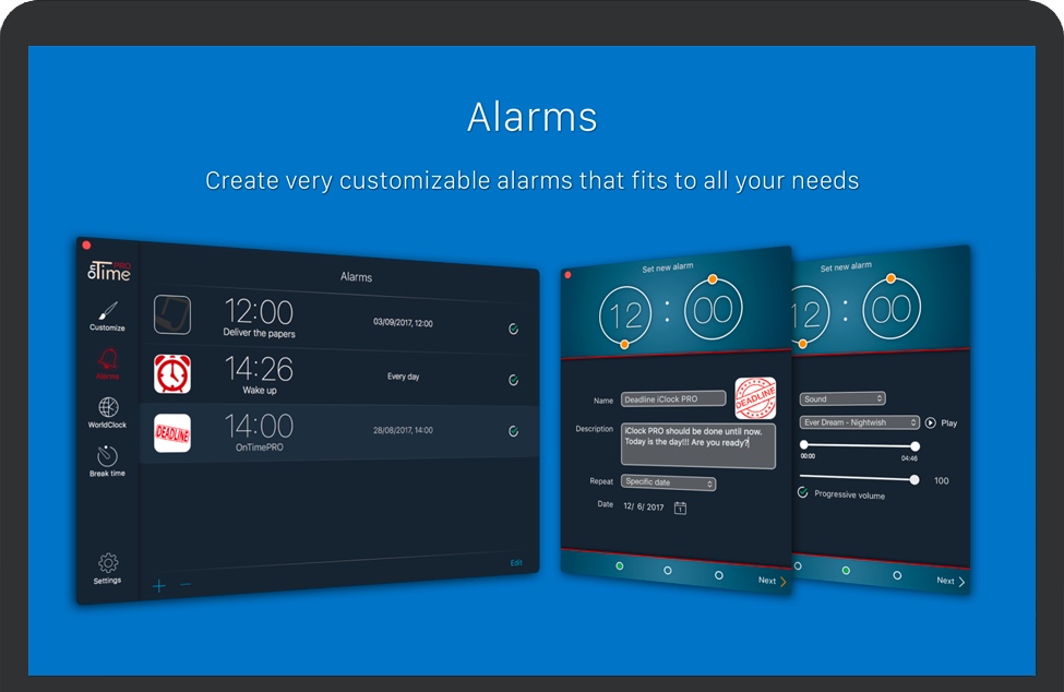 OnTime PRO for Mac 是您永远需要的一款不可或缺的时间工具。使用直观的界面,您可以为您的桌面创建无限漂亮和有用的时钟。永远不要忘记您需要做的重要事情:使用闹钟功能,您可以根据需要轻松添加任意数量的闹钟。使用世界时钟查看世界任何角落的每一刻时间。OnTime PRO甚至会告诉你在工作时休息一下,以提高工作效率。