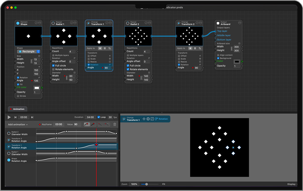 Patternodes是完全无损的,因此您可以随时更改序列中的任何步骤,而无需重做任何事情。这使得调整重复计数或元素属性变得容易,并立即看到最终结果。控制每个节点的参数也可以连接到其他节点,从而建立一个属性控制另一个属性的复杂关系。最后,所有这些节点参数都可以使用时间轴中的关键帧进行动画处理。