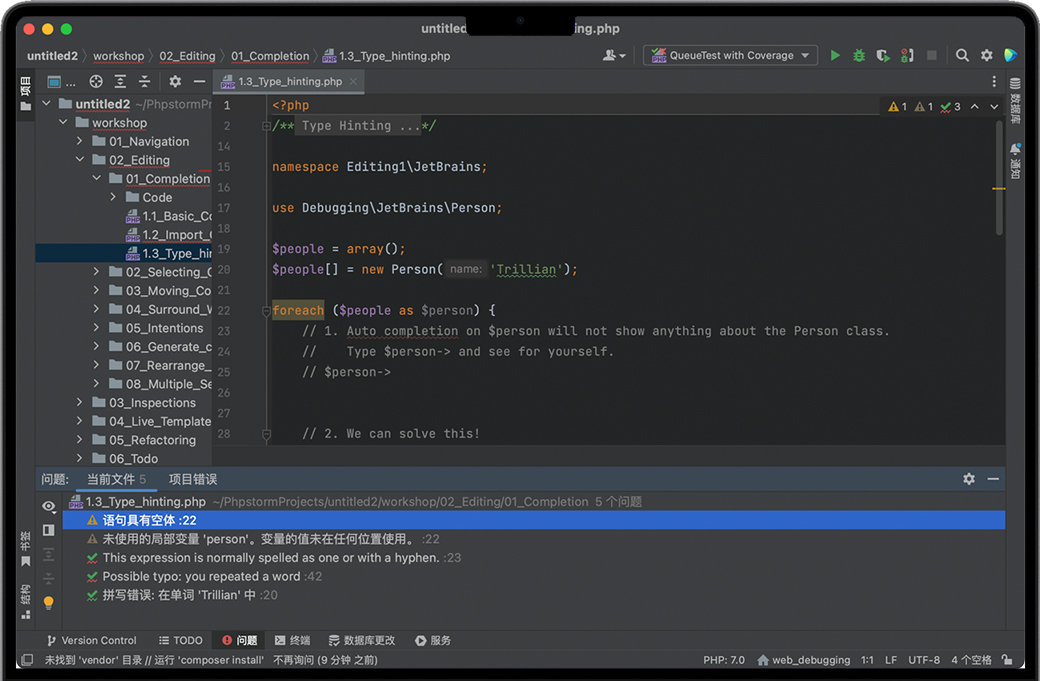智能代码辅助功能PhpStorm 是一个能够真正“解析”您的代码的 PHP IDE。 它支持 PHP 5.3-8.1,提供实时错误预防、最佳自动补全与代码重构、零配置调试,以及扩展的 HTML、CSS 和 JavaScript 编辑器。 智能PHP代码编辑器IDE 提供智能代码补全、语法高亮显示、扩展的代码格式化配置、实时错误检查、代码折叠,并支持语音混合等。 自动重构能够小心地处理您的代码,有助于轻松且安全地进行全局项目设置。 代码质量分析成百上千个代码检查会在您输入时验证代码并检查整个项目是否存在可能的错误或代码异味。 适用于大多数检查的快速修复能够轻松地立即修复或改进代码。 Alt+Enter可为每个检查显示合适的选项。 代码导航和搜索PhpStorm 可以帮助您在处理大型项目时提高编码效率,并节省时间。 只需点击一次或搜索用法,即可跳到方法、函数或变量定义。 调试、测试和性能分析PhpStorm 为调试、测试和分析应用程序提供了强大的内置工具。 调试零配置调试让您能够轻而易举地调试 PHP 应用程序。 另外,PhpStorm 提供多个选项,可以利用可视化调试器调试您的 PHP 代码,这样您就可以:检查变量和用户定义的监视、设置断点和在运行时评估表达式、调试远程应用程序、在多个会话中同时调试页面等。 测试您可以直接在 PhpStorm 中开发 PHPUnit 测试,并利用上下文菜单选项从目录、文件或类中直接运行它们。 PHPUnit 的代码覆盖率可以显示测试会覆盖多少代码。 性能分析您可以使用 Xdebug 或 Zend Debugger 分析应用程序并在 PhpStorm 中检查聚合的报告。 HTML/CSS/JavaScript编辑器PhpStorm 包含 WebStorm 与 HTML、CSS 和JavaScript 有关的所有功能。 HTML和CSS编辑器支持所有尖端的 Web 开发技术,包括 HTML5、CSS、 SASS、SCSS、 LESS、CoffeeScript、ECMAScript Harmony 和 Jade 模板等。 Live Edit 让您可以在浏览器中立即查看所有变更,而无需刷新页面。 JavaScript 编辑器最智能的 JavaScript 编辑器与 IDE 捆绑,提供代码补全、验证和快速修复、重构、JSDoc 类型注释支持、JavaScript 调试和单元测试,以及对 JavaScript 框架的支持等。 新技术PhpStorm 为使用新语言(如 TypeScript、CoffeeScript 和 Dart)的整个开发周期提供了简化的体验。 开发环境PhpStorm 建立在开源 IntelliJ 平台之上,过去 15 年以来,JetBrains 一直在不断发展和完善这个平台。 这个平台可以针对您的开发工作流进行微调并且能够提供高度可定制的体验。 VCSPhpStorm 以统一的 UI 处理多种流行的版本控制系统,确保在 git、GitHub、SVN、Mercurial 和 Perforce 之间提供一致的用户体验。 数据库和SQLPhpStorm 为在您的项目中处理数据库和 SQL 提供了工具和编码辅助功能。 连接到数据库,编辑架构和表格数据,运行查询,甚至利用 UML 图表分析架构。 SQL 代码可以注入其他语言,或者在具有语法高亮显示、智能代码补全、实时代码分析、代码格式化和导航等功能的 SQL 编辑器中编辑。 其他功能从 IDE 执行多个常规任务,支持 Vagrant、Docker 和 Composer 等。 |