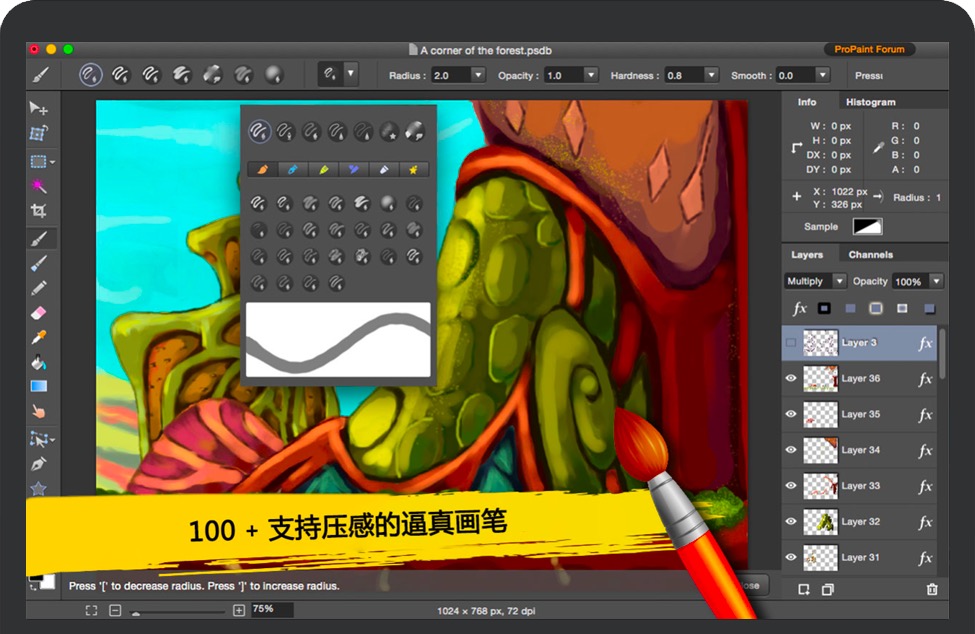 -大量的逼真的画笔:铅笔,水彩,喷笔,炭笔、特效笔等。快速调整画笔大小,轻松自定义和创建新的笔刷。