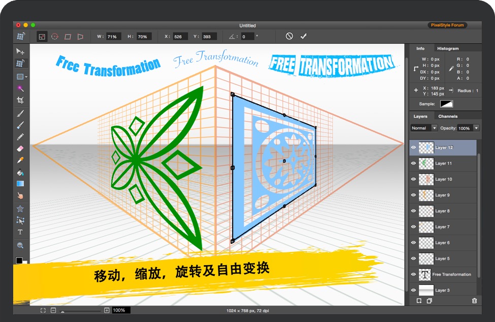 -支持自由变换功能:缩放,移动,缩放,旋转,倾斜,自由视角的转化和对准功能。