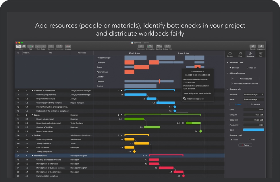 为您的项目添加资源:人员或材料,修改工时,找出瓶颈,公平地分配工作量并创建切合实际的计划