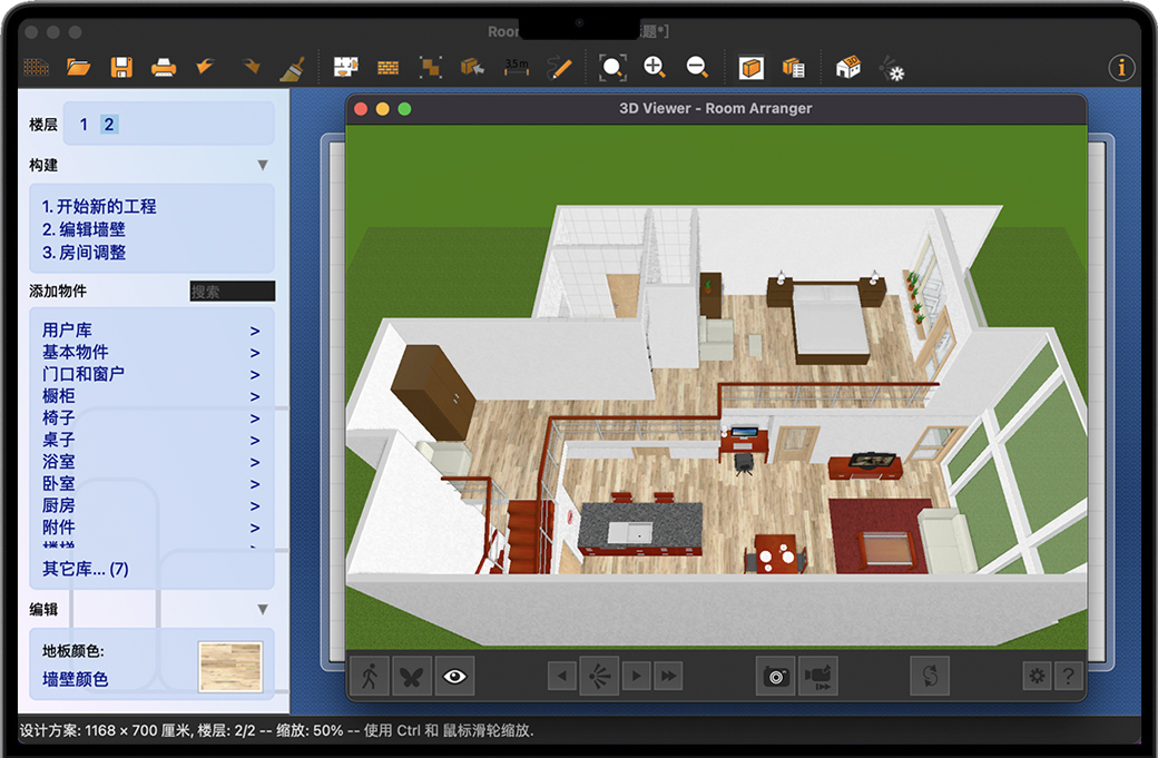 3D 可以给您对于自己的设计有更好的观感。Room Arranger 不只能让你穿梭于现场, 也能让你以拟真的行走模式徒步浏览。