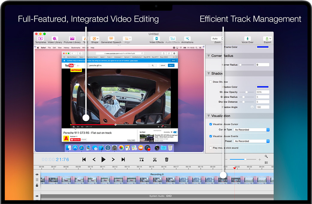 Screenium for Mac 也能将按键敲击和鼠标指针作为单独的轨道录制,以便您可视化鼠标的点按动作,或稍后再进行编辑,不会有任何麻烦。