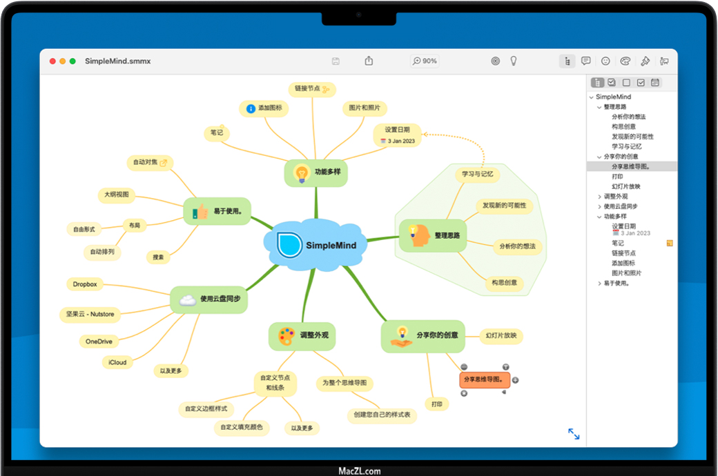 SimpleMind Pro for Mac 是一款轻量的思维导图软件,可将您的Mac变成头脑风暴,创意收集和思维结构设备。思维导图可帮助您整理想法、记忆事物并形成新的创意。SimpleMind Pro界面漂亮而直观,可供您随时随地使用。SimpleMind Pro for Mac功能很强大,贴图、表情、注释、结构、幻灯片模式应有尽有。