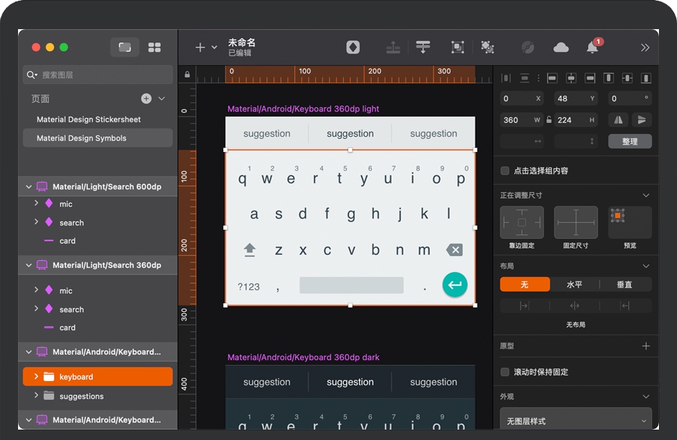 随着您的符号、颜色和样式成长为一个设计系统,Sketch 为您提供了管理它们的工具。组件视图让您可以在一个地方浏览、组织和编辑所有内容,同时由于可搜索菜单和专用的插入窗口,插入速度非常快。