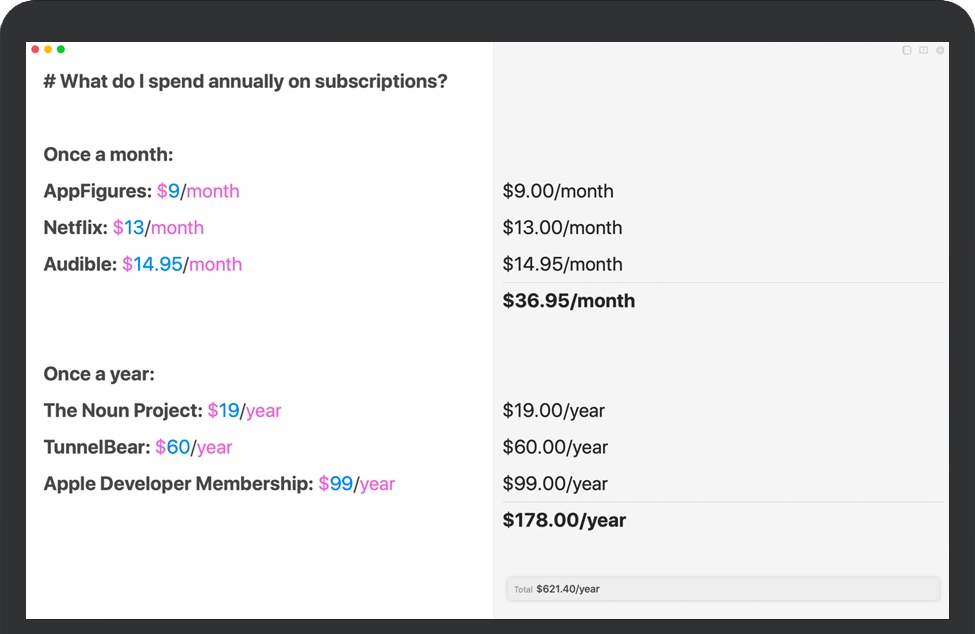 在多行的计算算式中,可以如同试算表一般灵活引用数据,加总计算、百分比计算,对于Soulver都只是小菜一碟。不仅如此,诸如货币之类的单位转换也是Soulver的拿手绝活,效率完胜试算表,更远比传统计算器来得智能。