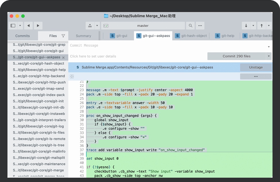 Sublime Merge 为您提供了轻松完成代码审查的工具:Side by Side Diffs、Syntax Highlighting、Character Diffs。您可以拖动大块的顶部或底部以交互方式显示更多上下文线。