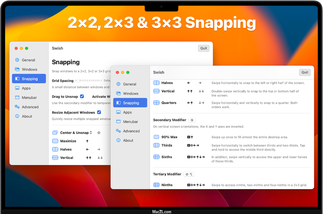 滑动是新的拖动。无需单击即可排列选项卡或窗口。您需要做的只是一些直观的手势。想在右下角放置一个窗口?Swish 使这变得如此简单——只需向下和向右滑动即可。它会飞,很神奇。