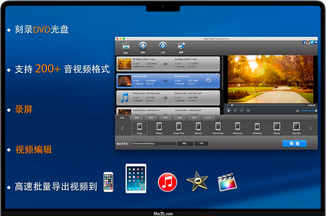 Total Video Converter Pro for Mac 中文名:超级转霸。是一款非常强大,全功能的转换器,视频编辑器和DVD刻录机,支持几乎所有的视频和音频格式。Total Video Converter Pro一款软件,兼具多款软件的功能:视频/音频转换 + 视频刻录 + 屏幕录制 + 视频/音频编辑 + 视频/音频裁剪 + DVD刻录 + DV自动输入 + 视频合并/分割 + GIF输出 + 音频提取 + 视频特效 + 视频/音频复合。